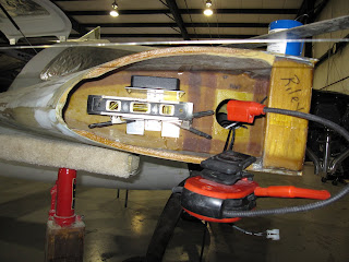 It's time to mount the magnetometers. You may recall that I fabricated a mount which keeps both magnetometers aligned with each other, but it is adjustable only in yaw. Therefore, it required some fixtures to bond the mount in exactly the right position. I needed a steady reference point to work from. I cut some aluminum angle pieces. I leveled the fuselage in pitch and roll. Then, I drew a line on the bulkhead with a level. I used 5 minute epoxy to bond the angles on the level line. There's one axis taken care of.